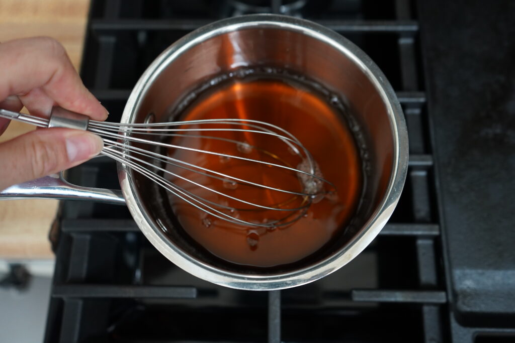 - Step one, we are going to add a 1/2 cup of water to the saucepan, followed by our 1/2 cup of maple syrup.